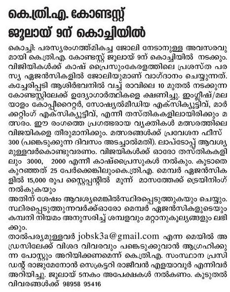Kochi, July 9, 2022 — The Kerala Advertising Agencies Association (KAAA) hosted a significant job vacancy event on July 9, 2022, in Kochi. This event provided aspiring professionals with opportunities to explore various roles within leading advertising agencies. The event was a valuable platform for individuals seeking to embark on or advance their careers in one of Kerala's most vibrant and creative industries.
